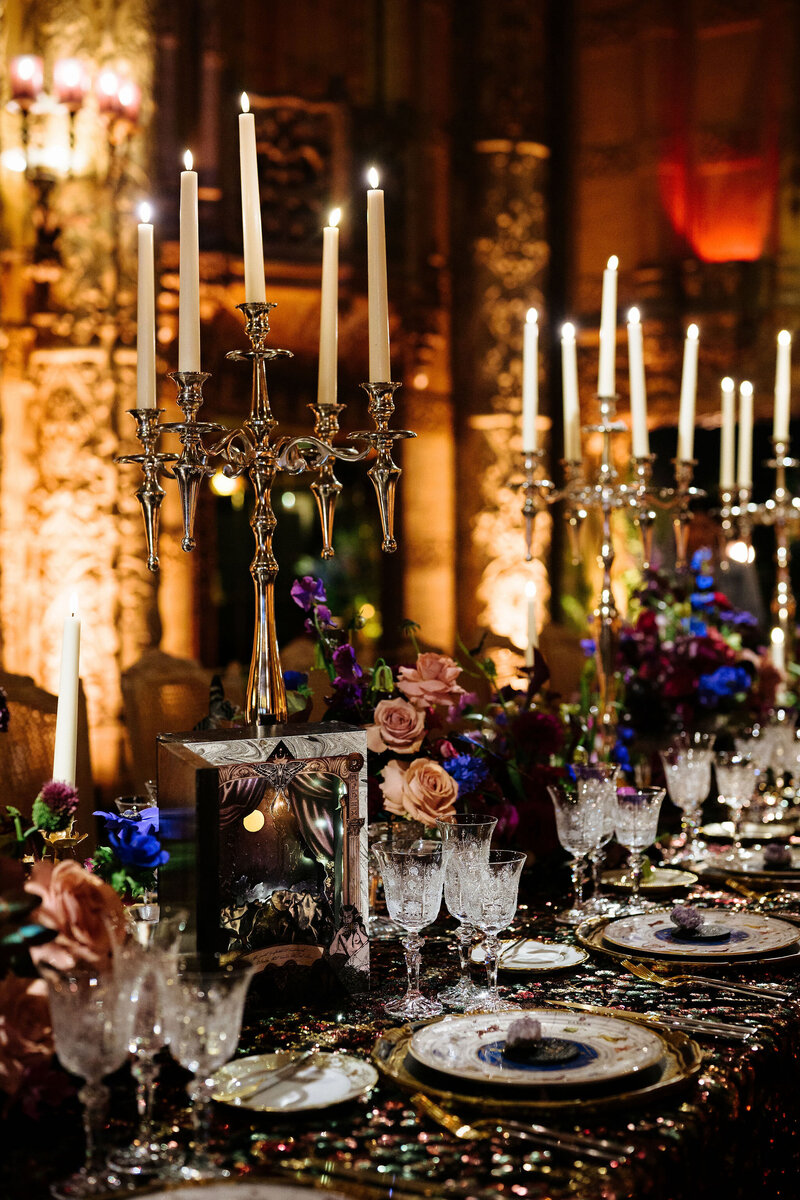 Guests stepped into a beautiful garden and enjoyed an Aperol spritz bar, passed appetizers, and a Mediterranean grazing table. The dinner tables featured colorful flowers in a collection of different pottery and brass vessels. We rented a variety of colorful mismatched water and wine goblets, ceramic plates, neutral linen napkins, and gold & black flatware. Ivory pillar candles and blue hurricane candles created a beautiful tabletop glow.